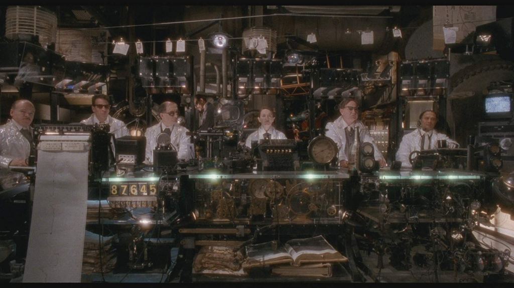And for all the film tells us is inevitable, it still revels in the ambiguity of motivations, purpose, and reality. Director Terry Gilliam uses an exceptionally light touch when introducing ideas in the plot, enough to make you leave your viewing with plenty to ponder. There is a multitude of elements within the film to appreciate, as well, that each contributes in some way to the uncertainty the audience feels. The frequent use of Dutch angles, a flat filter, and harsh, bright lighting help convey an unease through visuals. Although the representation of technology in this film is very much restricted to the limited imagination of the 1990s, the production design does succeed in creating a believable yet mildly outlandish view of a dystopian future. The electrifying performance of Brad Pitt as Jeffery Goins also delivers a major contribution. This character is burdened with being friendly, unbalanced, unpredictable, deranged, and intelligent in every scene he is in, and in the hands of a lesser actor, could have become a slapstick-heavy comedic relief character, but instead is an important player that you cannot pin down for sure. Even Bruce Willis, a man notorious for not caring about his work, puts in a very respectable and committed performance that could easily be delusional.